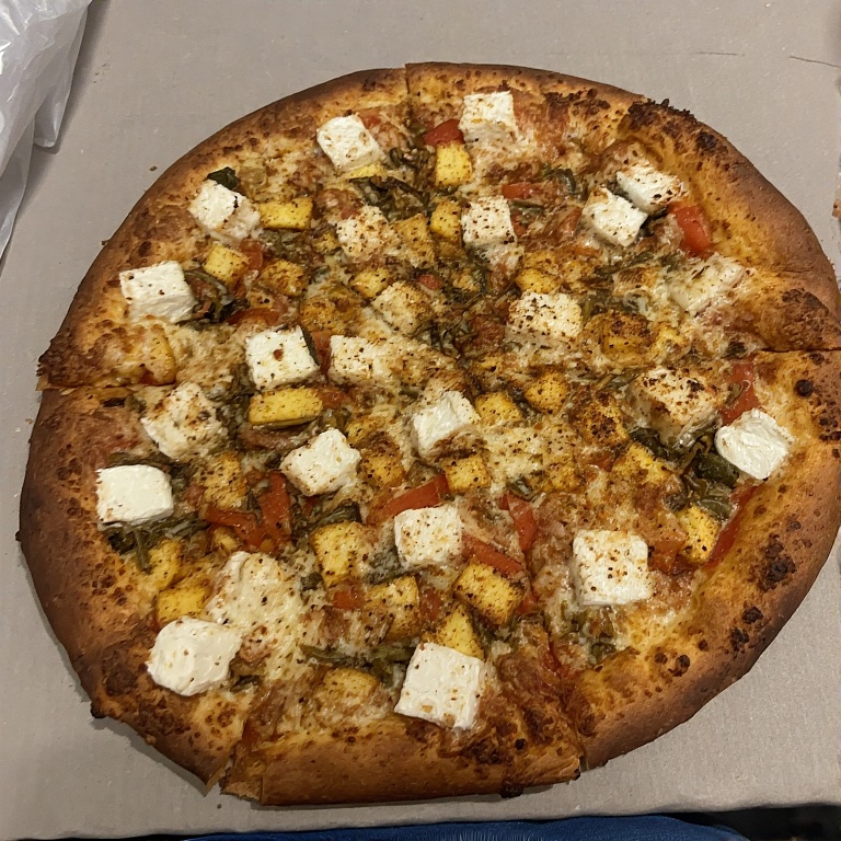 Cottage cheese cubes with garden veggies and mozzarella.